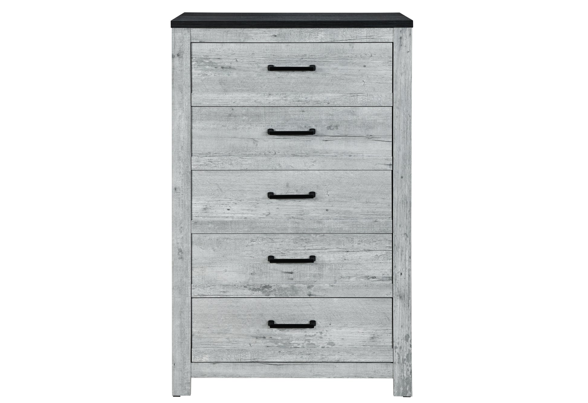 Indulge in the raw beauty and timeless appeal of the Amir Bedroom Collection by . Each piece in this captivating ensemble is finished in a rustic grey wash that exudes warmth and character, while the contrasting black tops on all case goods add a striking visual balance. The Amir is thoughtfully designed to bring a sense of rustic sophistication to your sanctuary. The bed boasts a plank design on the headboard and footboard, lending a handcrafted look to your sleeping space. Complementing this centerpiece, the dresser, nightstand, and chest all feature rustic hardware, enhancing the natural charm and ensuring durability. The Amir Bedroom Collection is the perfect blend of rustic allure and contemporary craftsmanship, making it ideal for anyone looking to infuse their bedroom with a touch of elegance and comfort.