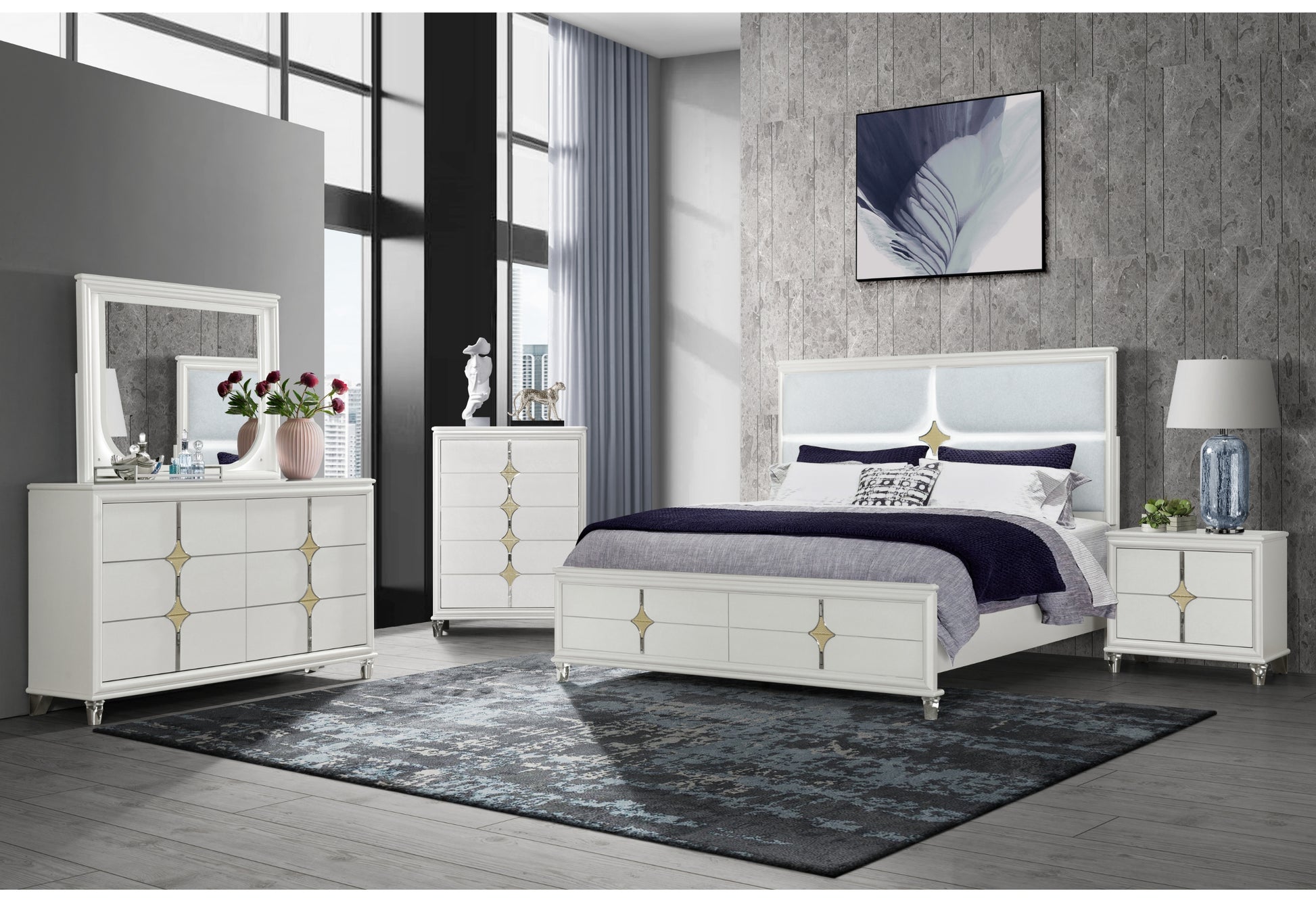 The Andrea Bedroom Collection, a stunning blend of modern design and luxurious details. Finished in a sleek white, each piece in this collection features textured drawer fronts and hidden drawer pulls, complemented by elegant gold accents and acrylic legs. The collection's standout features include LED accent lighting on both the bed's upholstered headboard and the mirror. With its contemporary aesthetic and sophisticated touches, the Orion Bedroom Collection is truly a showstopper.