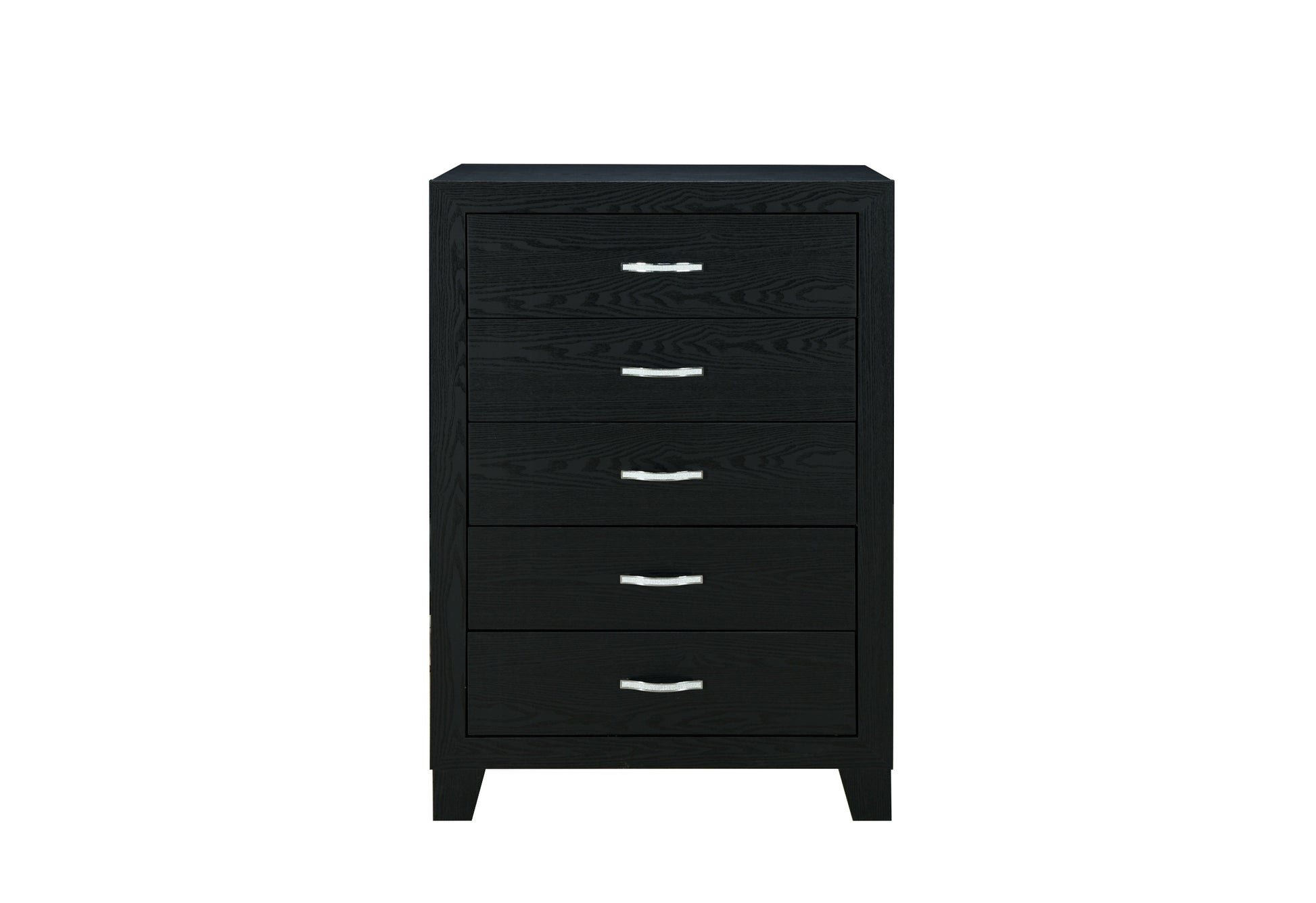 The Amanda Chest from the Amanda Bedroom Collection is a chic storage piece with a sleek black wood finish and glamorous hardware. This chest offers ample storage space while enhancing the modern aesthetic of your bedroom.