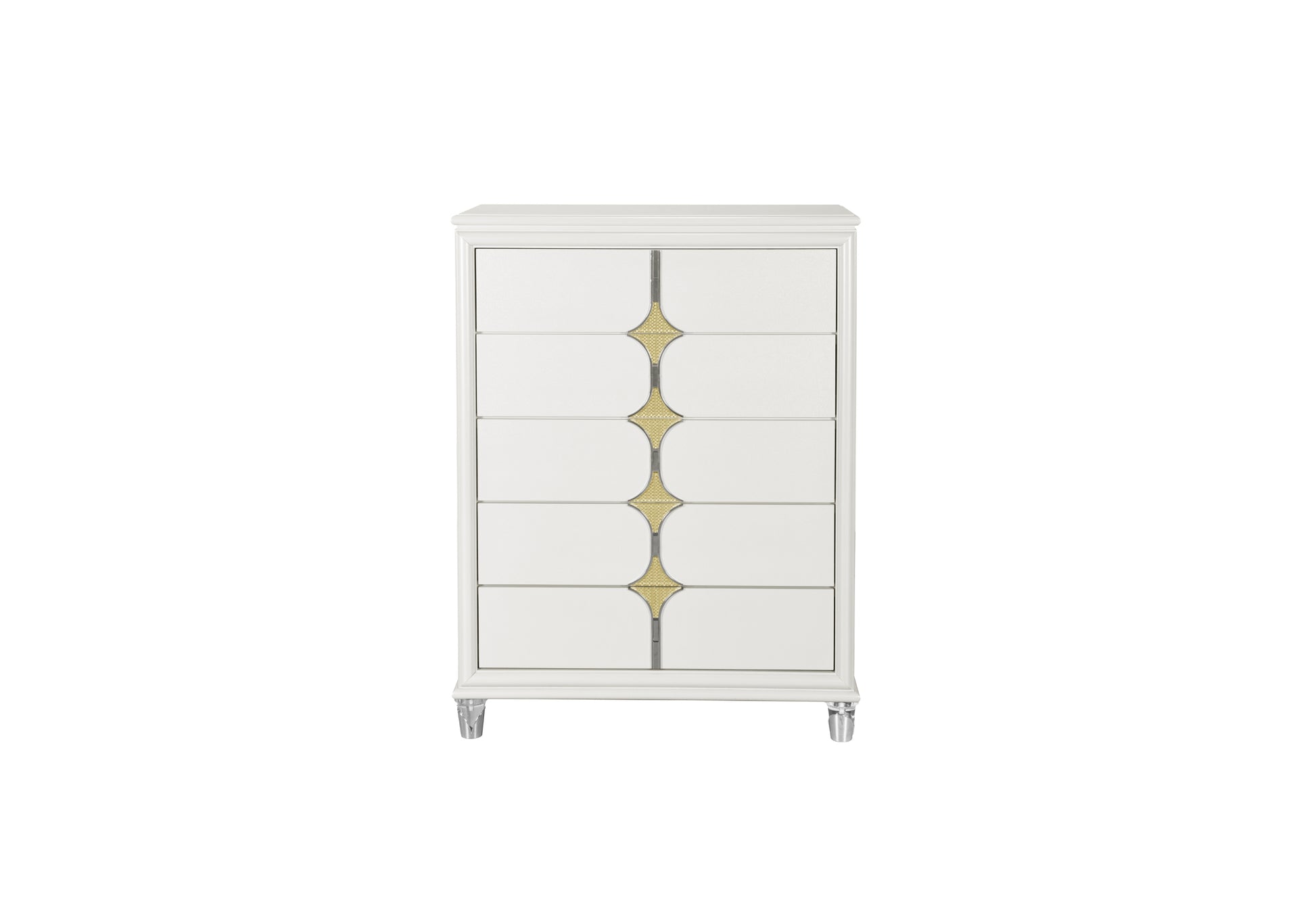 With a design that mirrors the sophistication of the entire collection, the Orion Chest offers storage for all your essentials. The Andrea drawer fronts and hidden pulls maintain a clean, modern look, while the gold accents and acrylic legs provide a chic finish.