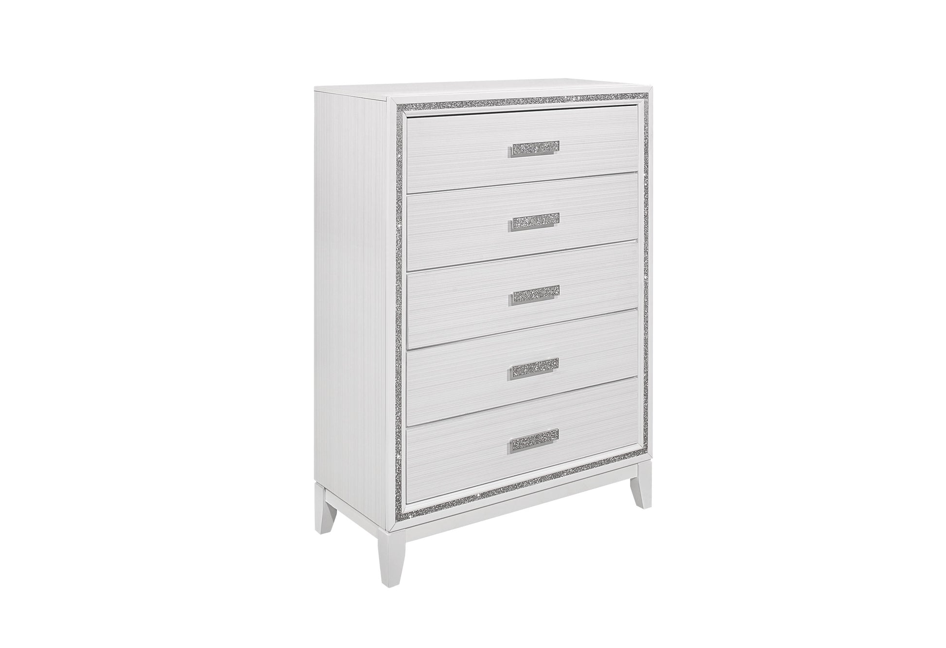 Ariana bedroom brings two worlds together. The Ariana lines and modern accents create a beautiful transitional glam bedroom look. The crushed crystal like look outlines all the pieces along with LED lighting accenting the head board. The crushed crystal like design is not only used as an accent trim but is also carried over to the hardware. The end result is a beautiful glam bedroom.