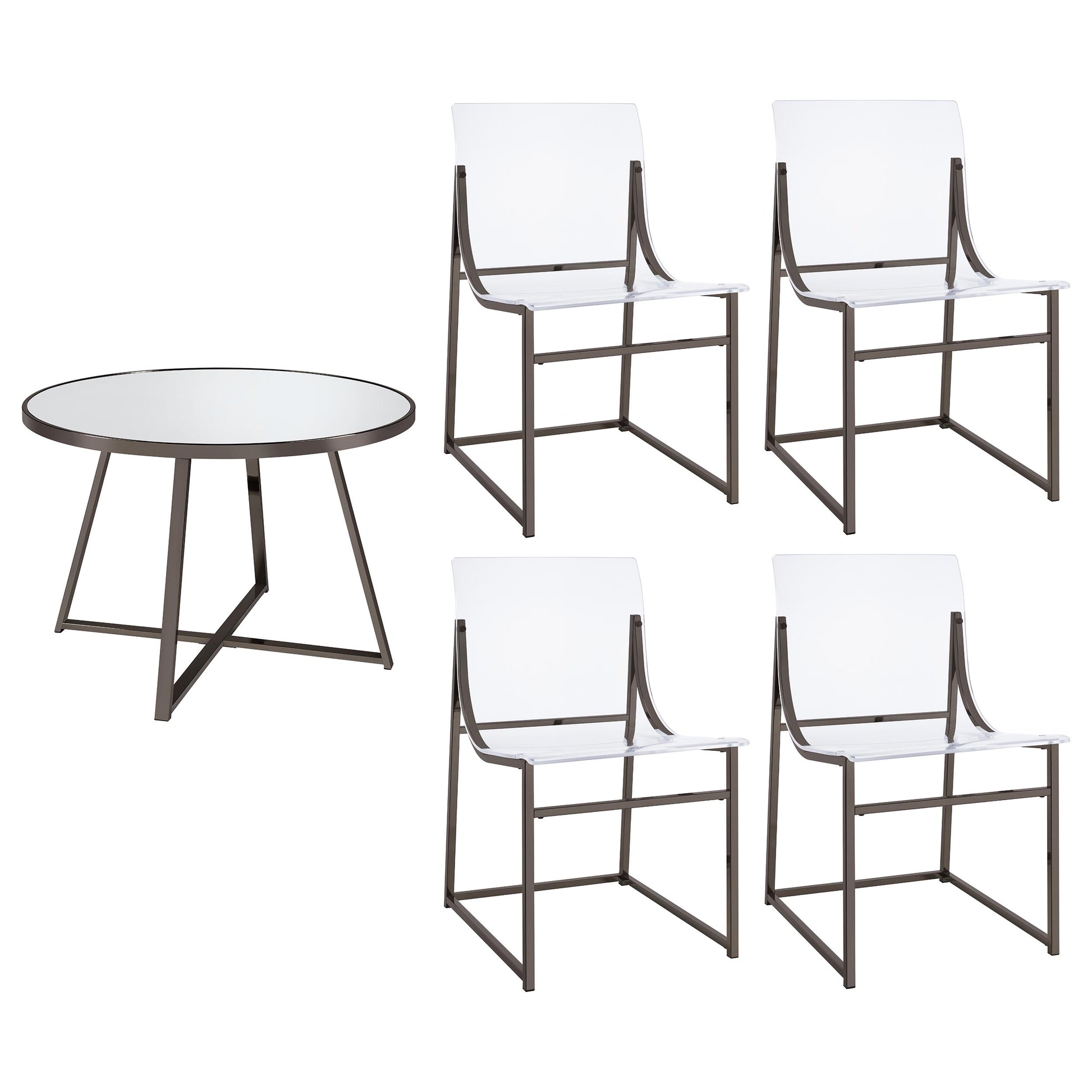 Elevate your dining experience with this striking five-piece dining set, blending contemporary design with modern elegance. The centerpiece is a round dining table, featuring a sleek mirror glass tabletop and supported by angular, open frame legs that add a touch of geometric flair. Complementing the table are four avant-garde dining chairs that redefine modern style with their clear acrylic backs and minimalist metal frames. The black nickel finish of the table and chairs enhances the set's sophisticated appeal, making it perfect for both casual meals and elegant entertaining. Whether hosting dinner parties or enjoying a quiet meal, this dining set transforms your space into a chic dining oasis.