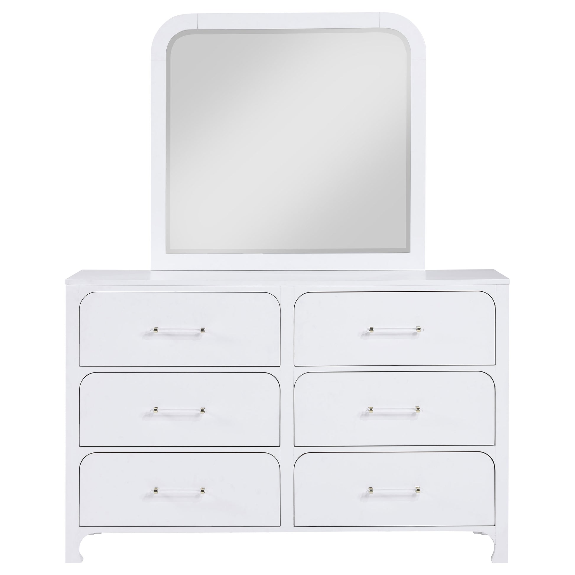 Augment a stylish bedroom with the added storage of a modern six-drawer dresser that includes a framed mirror. Simple and stylish, the dresser features rounded details on its drawer fronts and the mirror frame, creating a sense of movement and flow that blends in casual and more formal spaces. Its wide top provides plenty of space for decor or a jewelry box, while six roomy drawers help to keep clothing and accessories in their place. Drawer fronts are accented with clear bar pulls and delicate hardware that adds the perfect hint of dimensionality. A clean pearl white finish completes the look to perfection.