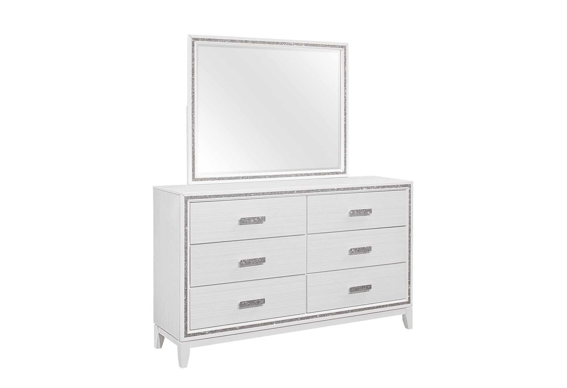 Ariana bedroom brings two worlds together. The Ariana lines and modern accents create a beautiful transitional glam bedroom look. The crushed crystal like look outlines all the pieces along with LED lighting accenting the head board. The crushed crystal like design is not only used as an accent trim but is also carried over to the hardware. The end result is a beautiful glam bedroom.