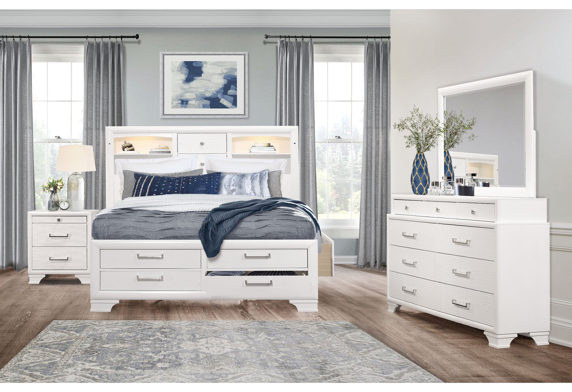 Introducing the Bianca Bed Group from , the ultimate statement for any bedroom. The Bianca is designed with a platform design, eliminating the need for a box spring while adding room for storage drawers. The headboard features built-in lighting and two storage drawers for convenience. All case pieces are lacquer finished and feature nickel hardware. Upgrade your bedroom with the Bianca Bed Group and enjoy its sleek and modern design for years to come.