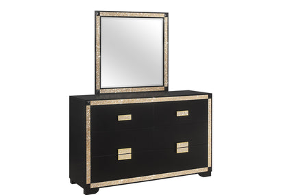 The Jordan collection combines style and elegance with many beautiful features. The collection is outlined with gold colored crushed crystal to highlight its unique design. The Bed has a tall headboard and two lights along with quilted padding. The lights add style, design and function which can be used as reading lights. The quilted padding complements the design and adds comfort. All the other pieces have the black finish and crushed gold crystal outline complemented by the black and gold hardware.