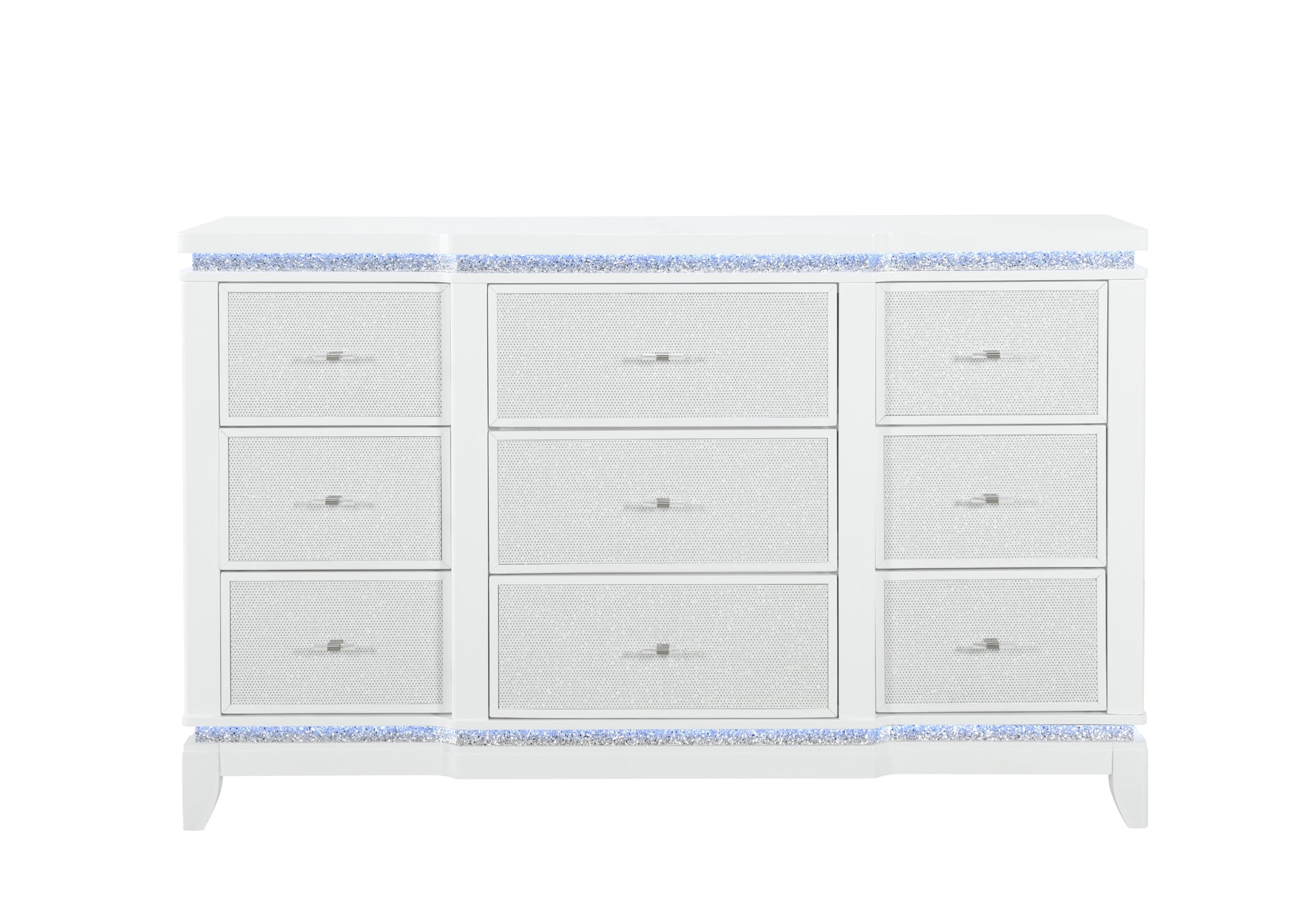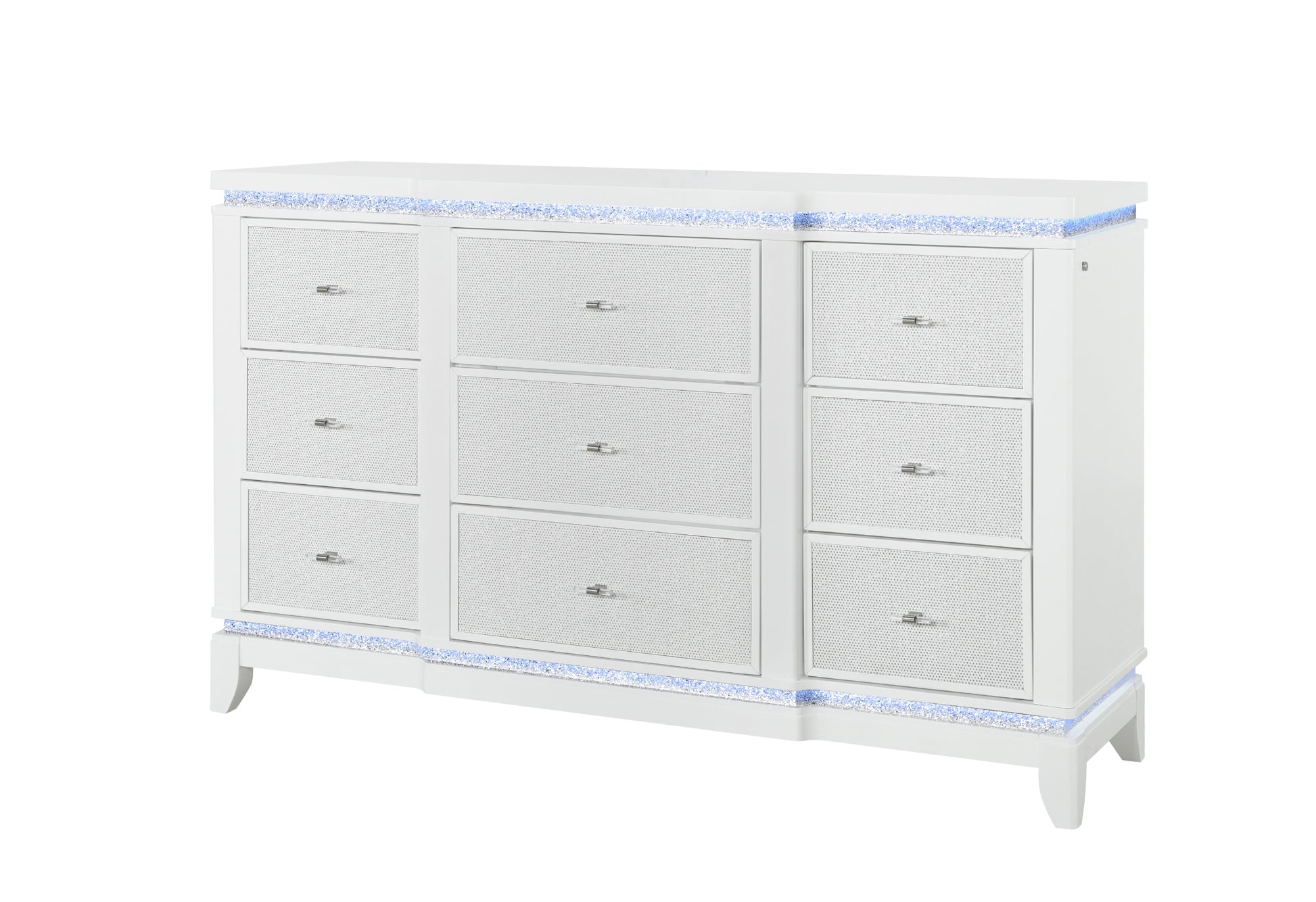The Riley Dresser is an exquisite fusion of functionality and style. Its white finish harmonizes with LED-lit crushed glitter, while the perforated silver glam drawer fronts provide ample storage space that's as accessible as it is striking. Each pull is a statement of luxury, ensuring your storage solutions are never dull.
