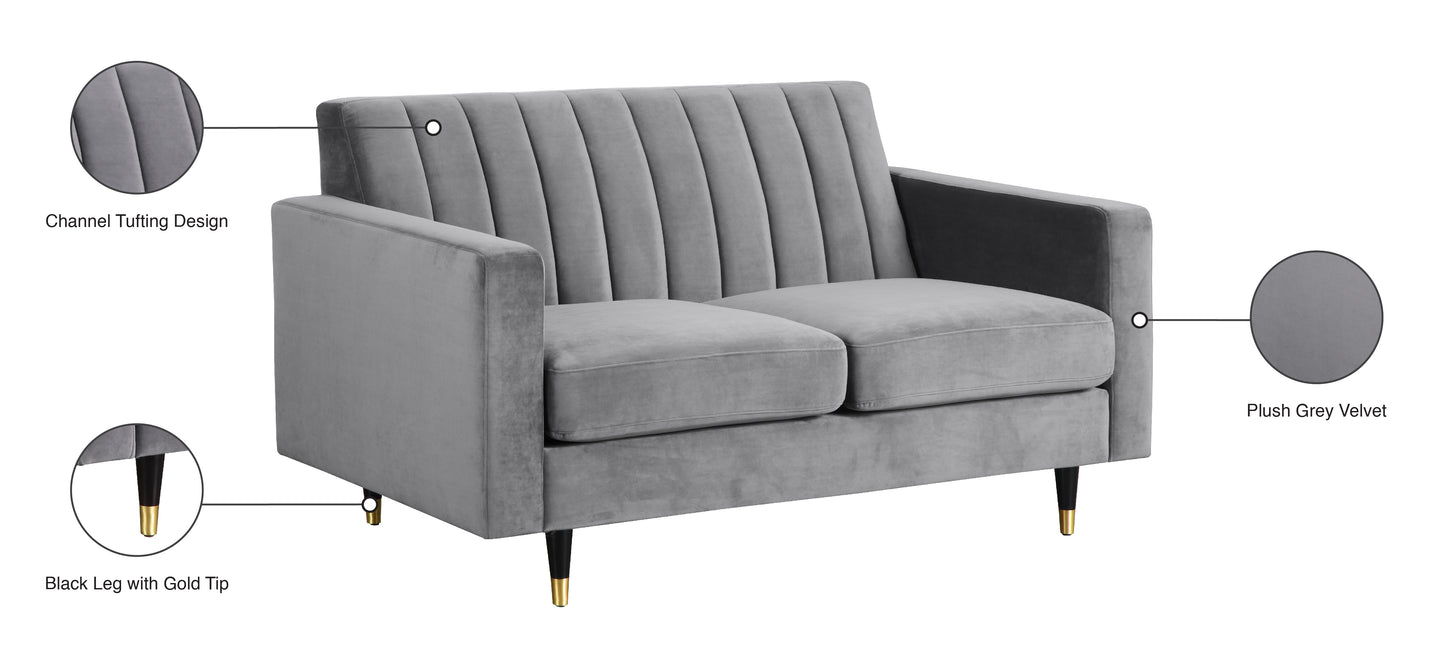 Cozy up to the comfort of this Lola Grey Velvet Loveseat. Its rich color adds a jolt of excitement and fun to your space, shaking things up in a neutral-colored room. The back is channel tufted for a beautiful, contemporary look and to help the back cushioning maintain its welcoming loft. Elegant slant-tipped black legs with gold tips lend this loveseat a charmingly modern finish and provide a sturdy foundation. Add it on its own, or add the matching sofa and chair for a coordinated look.