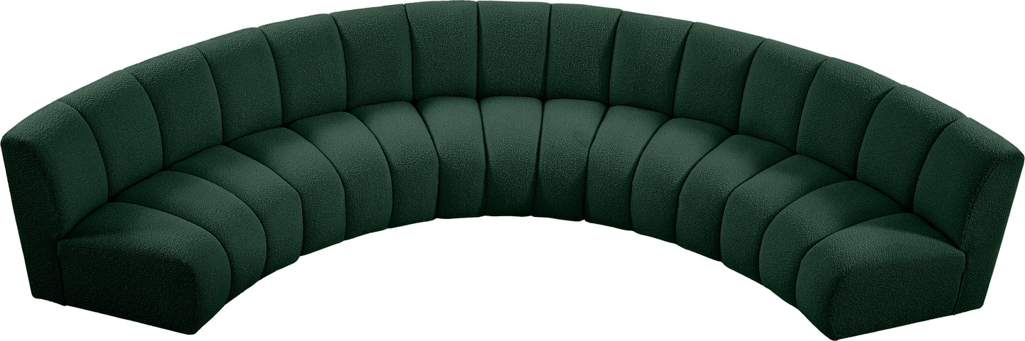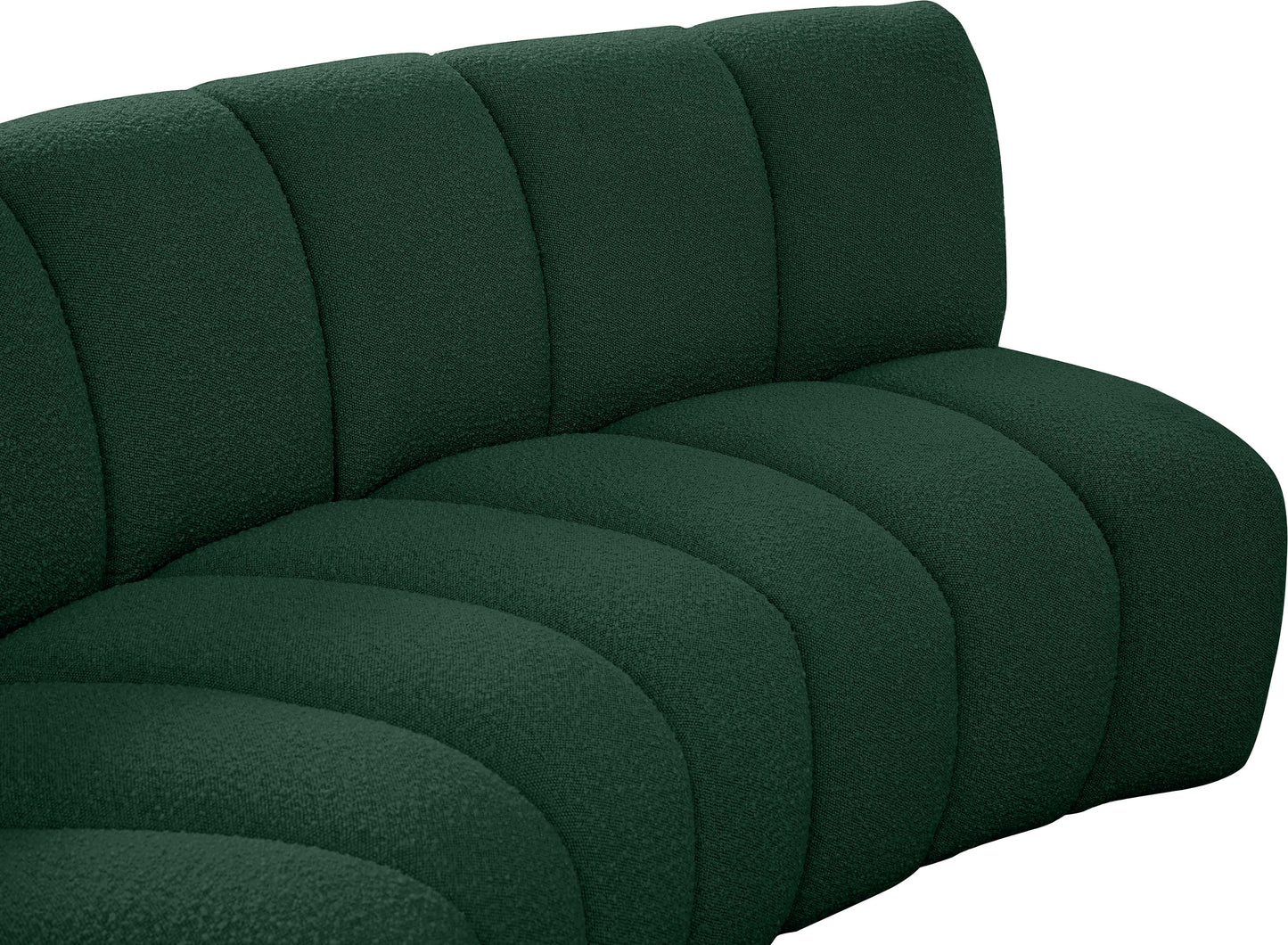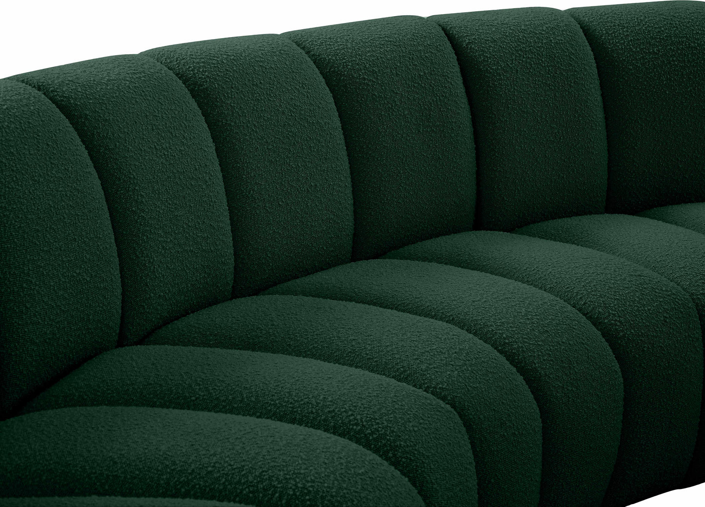 Mix and match this Infinity boucle fabric modular chair with other items in the Infinity collection to find the best possible seating solution for your gang. Rich green boucle fabric feels welcoming and soft to the skin, so you stay seated comfortably for the big game or while watching your favorite programs. Deep channel tufting adds to the longevity and durability of this modular chair while giving it texture.