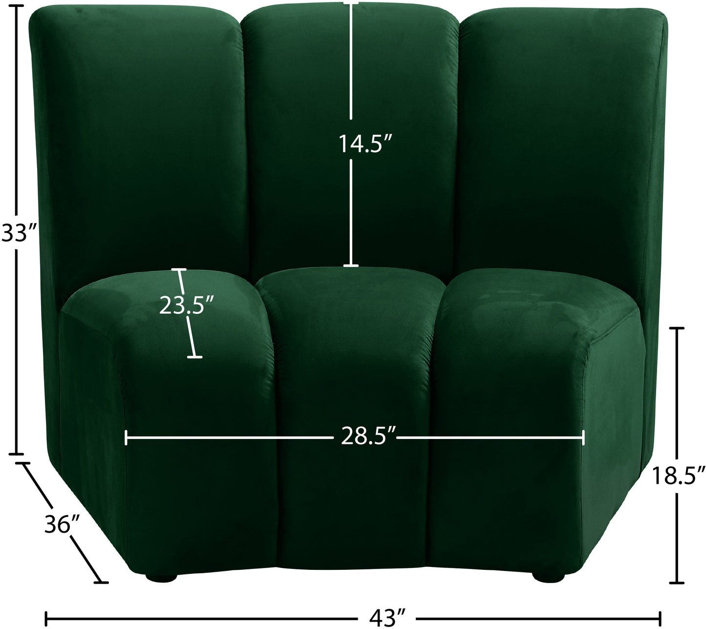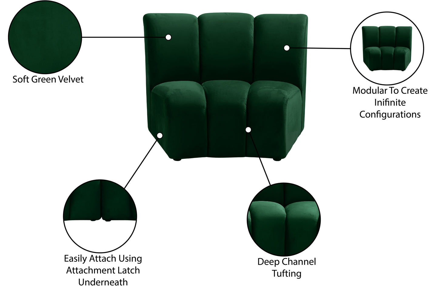 Create a seating group that works for every possible situation with this Infinity modular chair and other pieces in the Infinity collection. Upholstered in soft green velvet material that feels great against the skin and offers long-wearing beauty, this piece fits with other Infinity items for an infinite number of combinations that get your seating requirements just right but that look just as nice when used on their own.