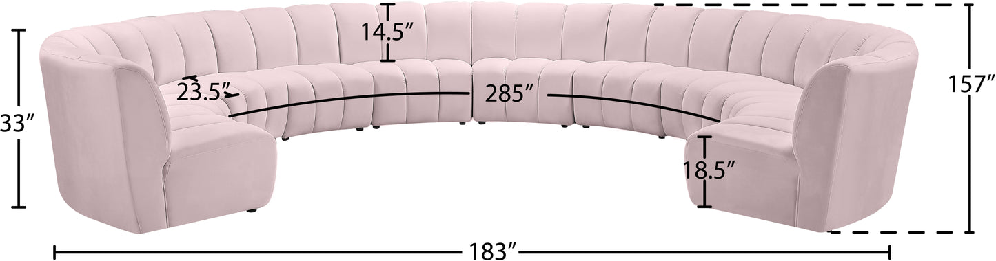 Create a seating group that works for every possible situation with this Infinity 10-piece sectional and other pieces in the Infinity collection. Upholstered in soft pink velvet material that feels great against the skin and offers long-wearing beauty, this piece fits with other Infinity items for an infinite number of combinations that get your seating requirements just right but that look just as nice when used on their own.