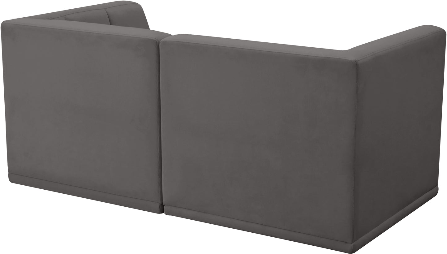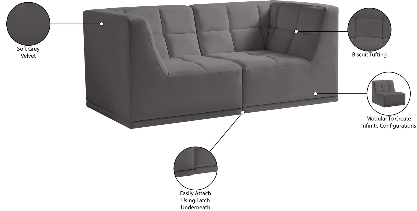 Bolster a contemporary vibe in your living room with this Relax grey modular sofa. Soft grey velvet upholstery offers delicate comfort, making this sofa cozy for anyone who sits in it. Biscuit tufting gives this sofa texture and a modern style, adding extra comfort and elegance to your living space. It's modular design allows you to create infinite configurations, making it a versatile piece to add to your home. A latch underneath the sofa makes it easy to attach to other pieces.