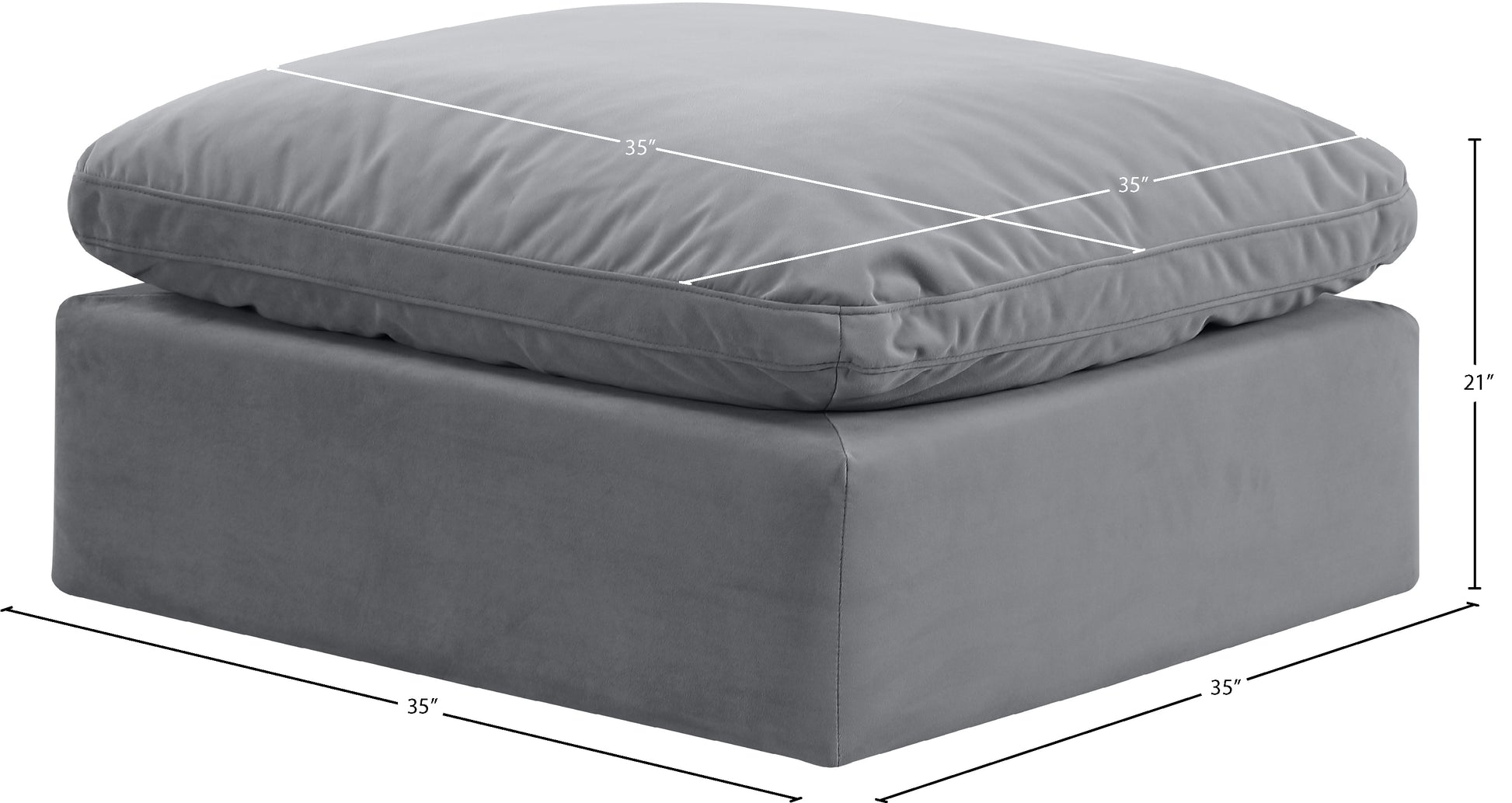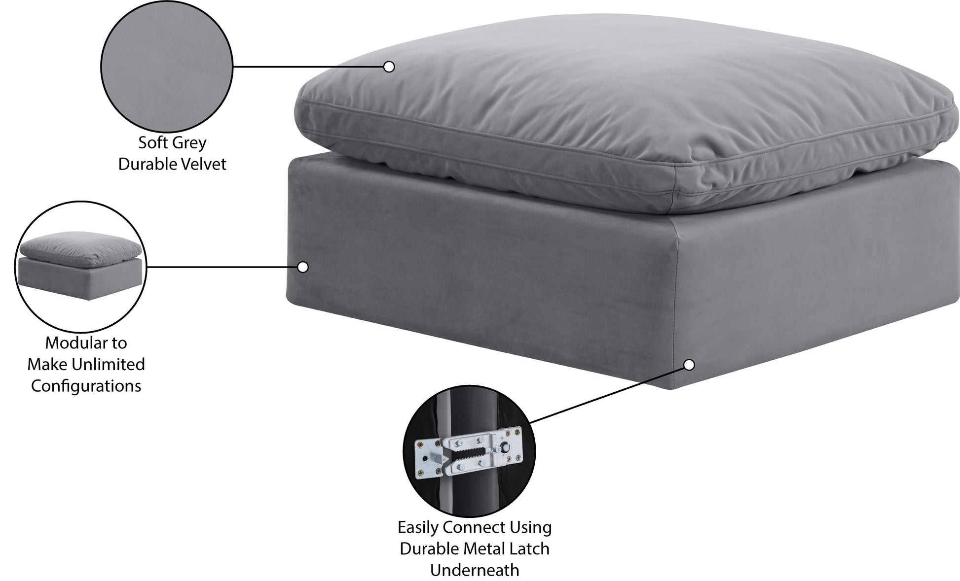 Experience ultimate comfort and style with our grey velvet Indulge Ottoman. The luxurious velvet will elevate the aesthetic of any room. This ottoman provides ample space for you to relax while its modular build offers the option of unlimited configurations. Whether you're looking to add a stylish element to your living room or a comfortable seating option to your bedroom, this ottoman is the perfect choice.